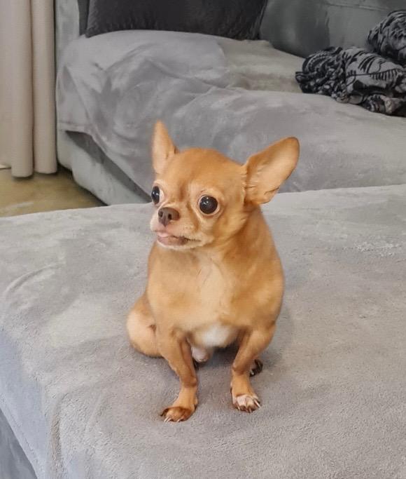 Peluche chien custom selon photo, environ 25cm. Avec un collier bleu, une médaille jaune et initiale brodée.